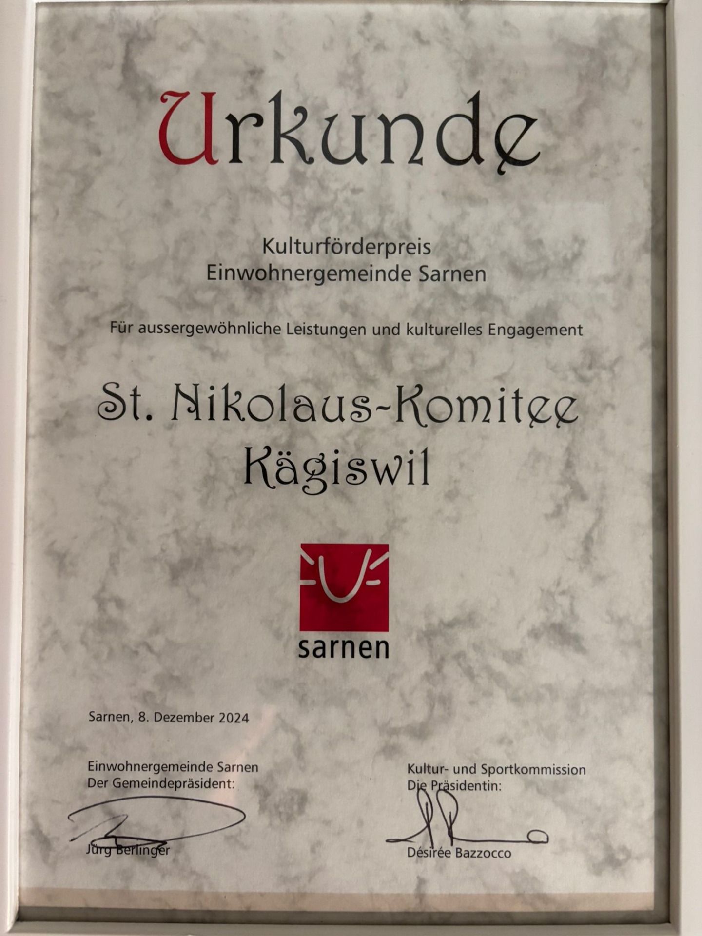 Wir bedanken uns ganz herzlich bei der Gemeinde Sarnen für die Auszeichnung mit dem Kulturförderpreis. Diese Anerkennung bedeutet uns viel und ist eine wertvolle Unterstützung für unsere kulturelle Arbeit.