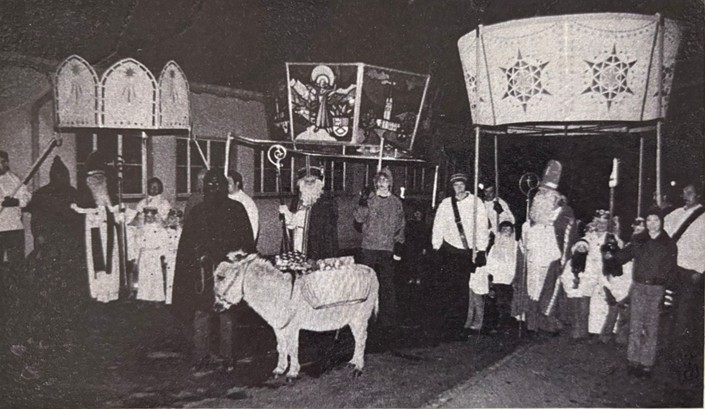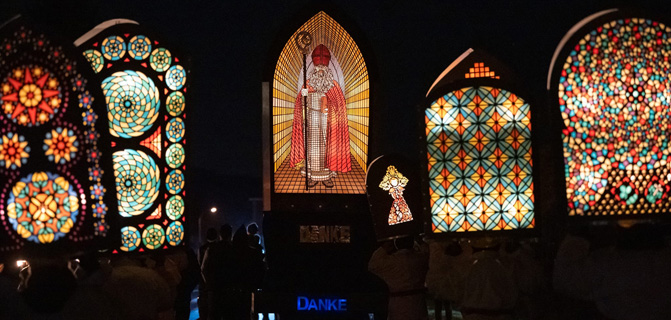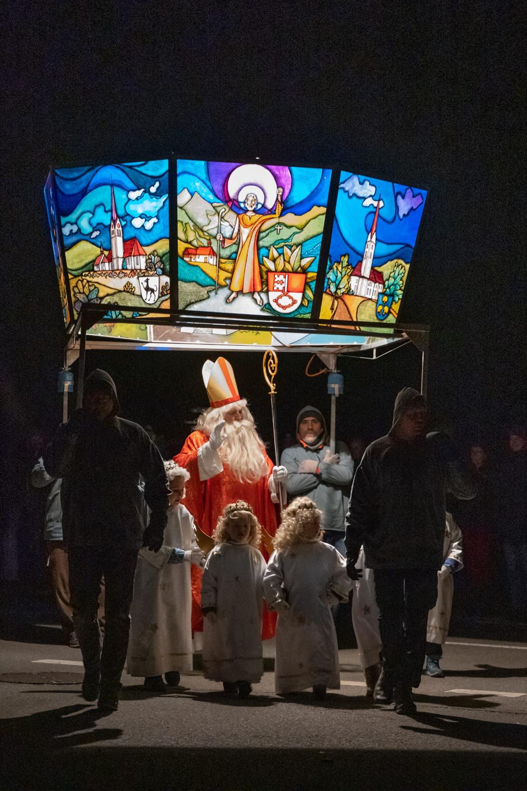 Der St. Niklaus zieht mit seiner prächtigen Krone, dargestellt sind die 7 Gemeindekirchen und -wappen des Kantons Obwalden, und seine Gefolge durch Kägiswil.